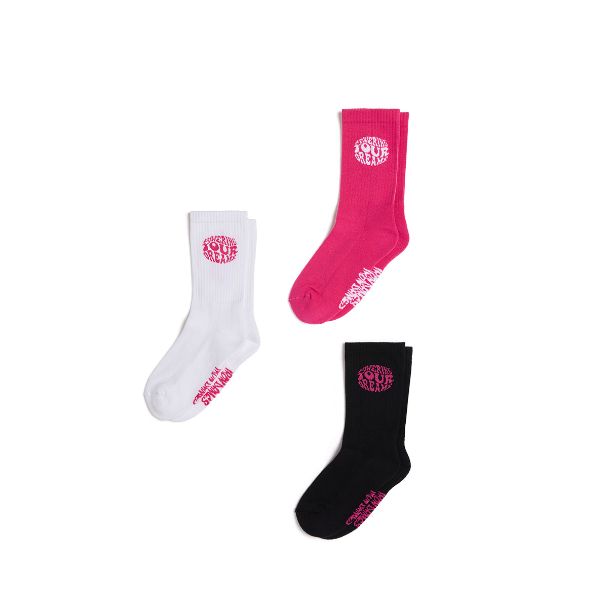 Socks kit with three pairs made of 100% cotton, in black, beige and magenta.