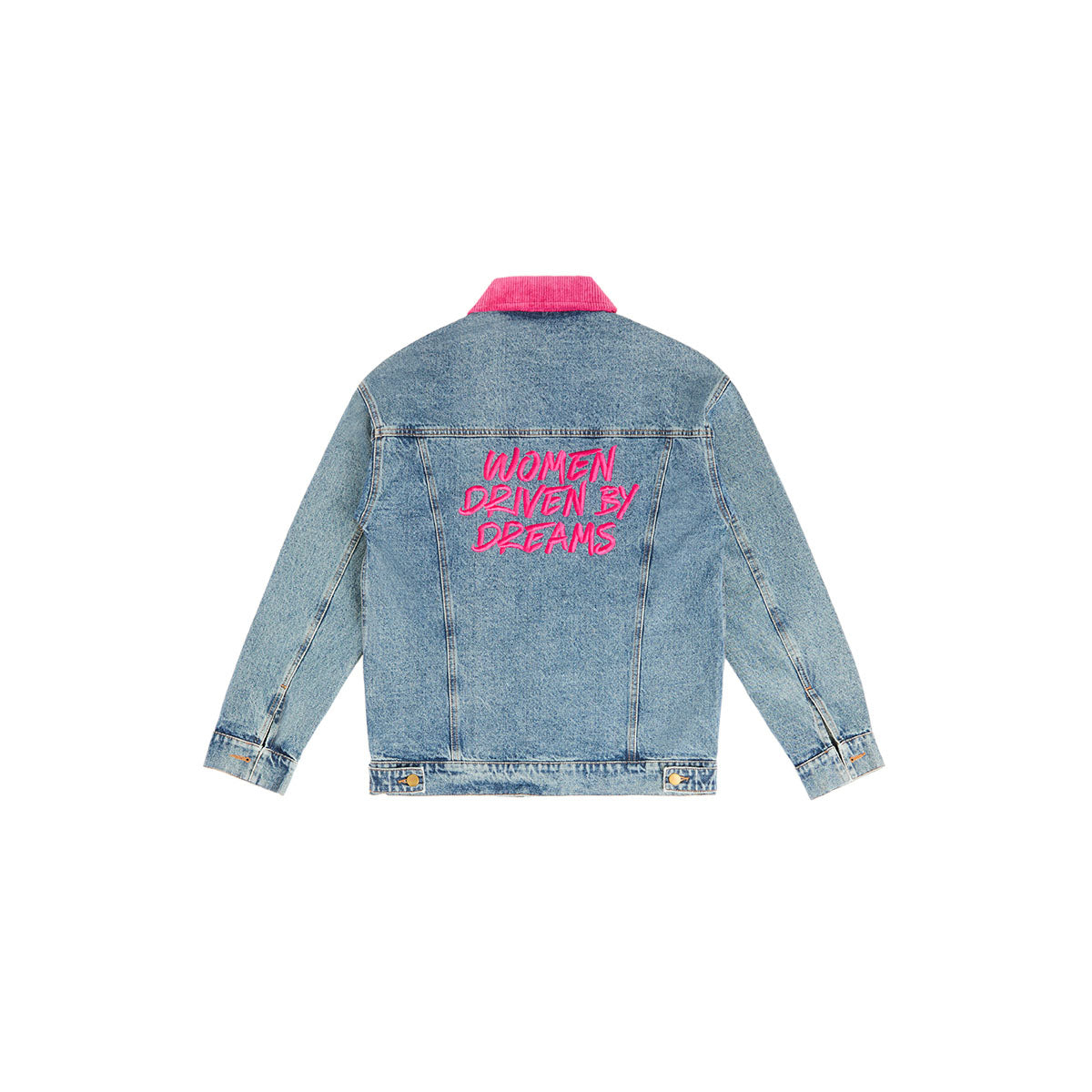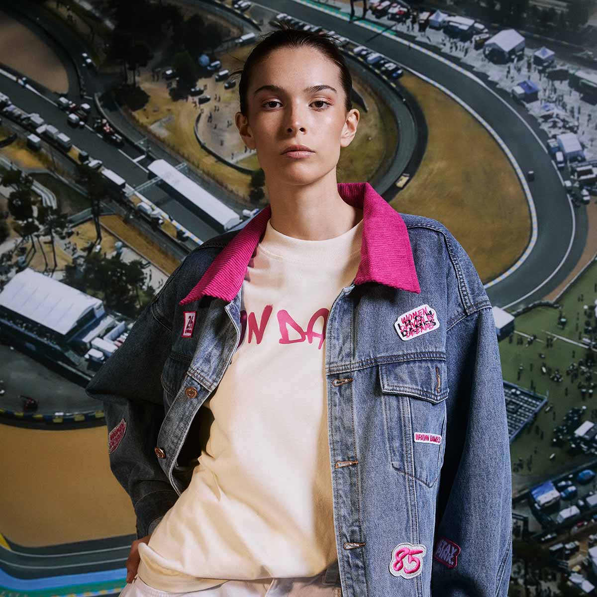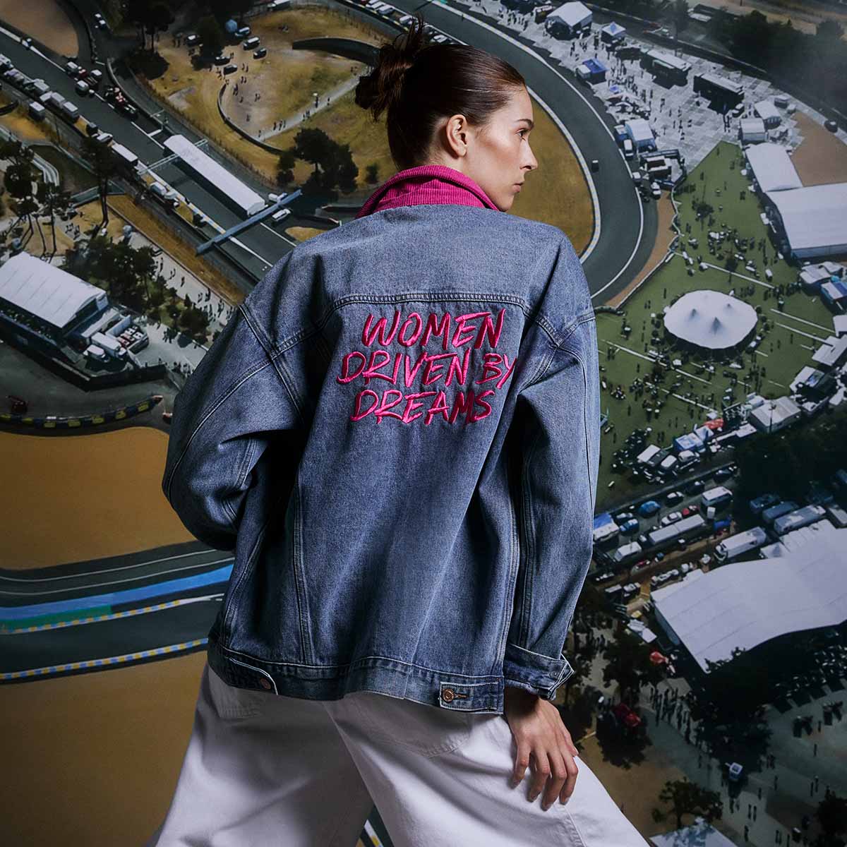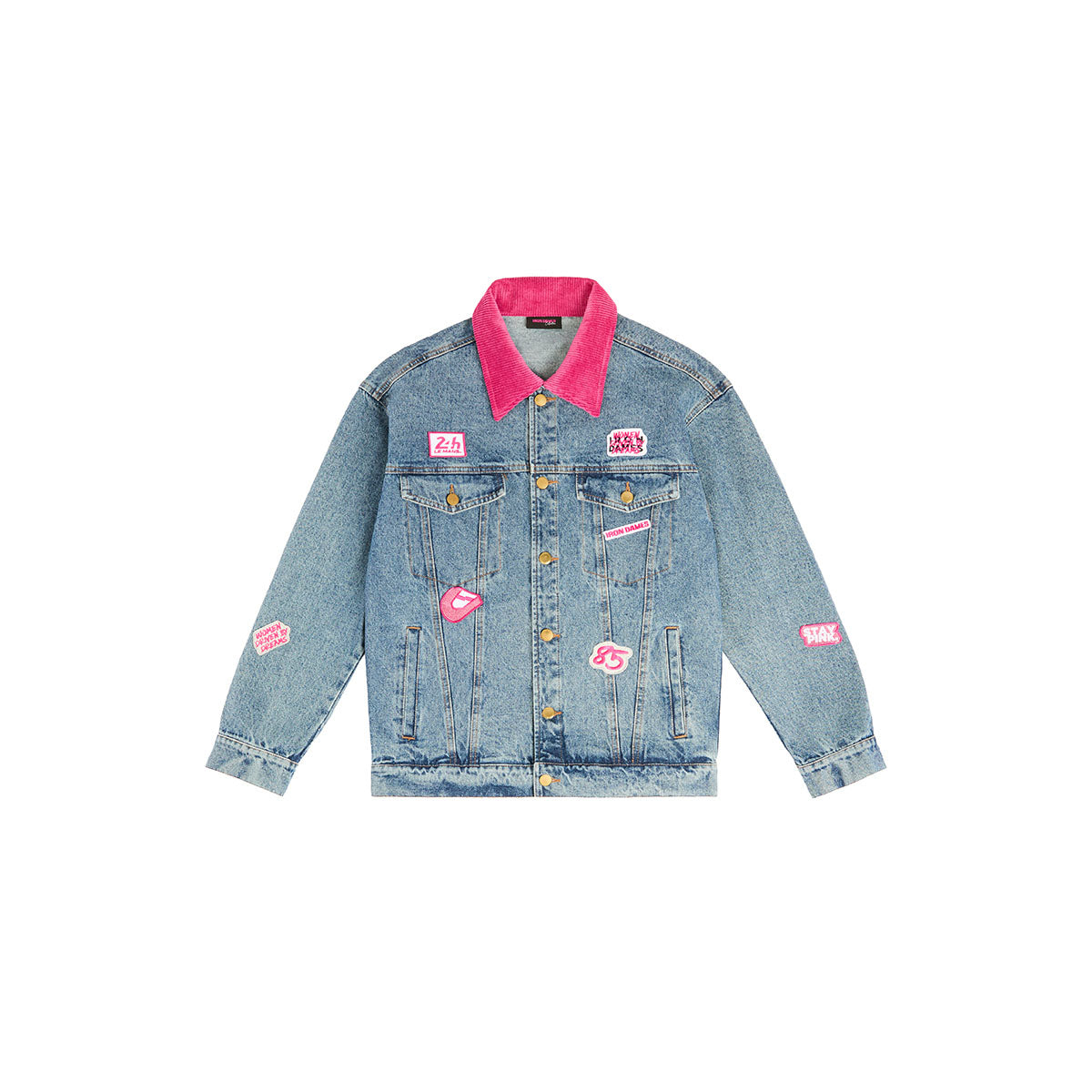 Features a contrasting magenta velvet collar and embroidered patches inspired by the unique Iron Dames stickers.